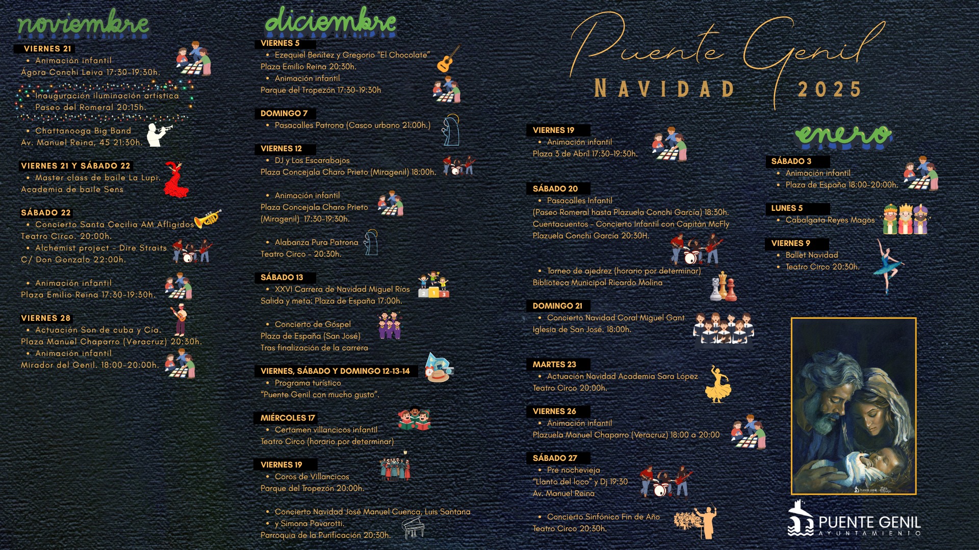 Navidad Puente Genil 2025 21 de noviembre de 2025 - 9 de enero de 2026 08:00 - 17:00 Puente Genil + Google Map Ayuntamiento de Puente Genil 957 600 853 957 600 853 Puente Genil